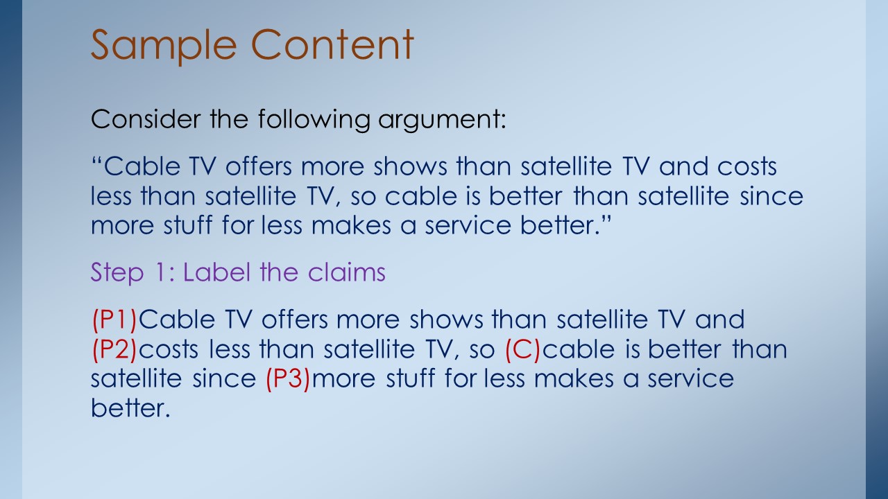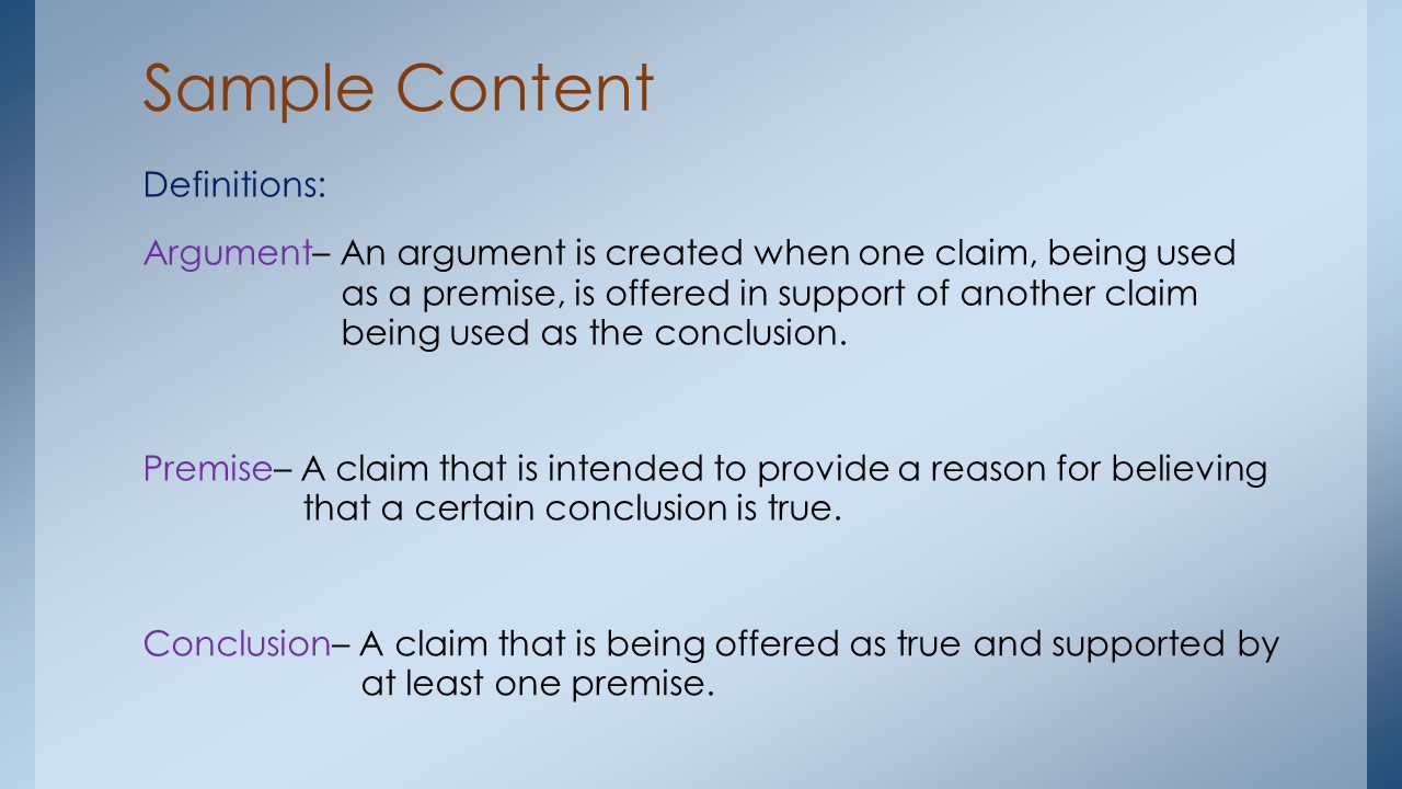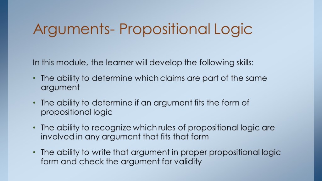 Here is the latest version of Arguments and Their Parts…this module develops the basic argument-identification skills needed for critical thinking.